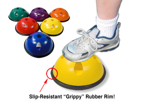 Action Domes™ and add-on items are non-intimidating, sting-free, very light, gross motor skill developers for early grades. Action Domes™ include a locking center-hole pole support structure and four side holes for horizontal pole positioning. An optional Deluxe Action Dome™ includes a slip-resistant dipped rubber rims for safer step and stand-on balancing. Accessories include, six 30” dia. Hoops; six 6” or 12” Hurdles; six 24” H Arches; and six 38” H Posts. All these segments snap together, are interchangeable, and are the strongest blow-molded segmented pieces made for play! The Obstacle Kit makes all the shapes: snap-together sections that create six 34” hi-impact Poles/Wands; six 24” H Arches; six 30” diameter Hoops, or six 12” H Hurdles. Action Domes™ are 9” dia. x 4” H. Action Domes™ are great indoors or out, but add-ons items are best suited for indoor play. Domes sold separately in 12’s in COLORZ.
