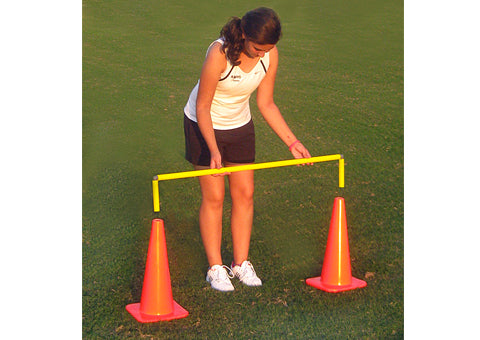 While most over/under bars are 30” to 36” wide, Drop-In™ Cone Crossbars are 40” wide for easier, safer, and less intimidating movement. Simply drop the 4” long ends into vinyl cone tops for a secure hurdle or crossbar that is held in place by gravity. Constructed of 1” diameter lightweight, high-impact extruded plastic that is guaranteed for life. Available in high-visibility yellow or in sets of 6 COLORZ.
